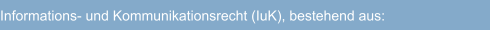 Telekommunikationsrecht; Software-/Computerrecht; Telemediarecht (eBusiness, Internet, Multimedia, Teledienstedatenschutz); Application Service Providing; Hosting; Housing; Outsourcing; Recht der gewerblichen Schutzrechte in Bezug auf IuK; Recht der IT-Sicherheit; gesellschaftsrechtliche, kartellrechtliche, wettbewerbsrechtliche und internationale Bezüge des Informations- und Kommunikationsrechts; IuK-Vertragsrecht, IuK-Vertragsgestaltung und IuK-Allgemeine Geschäftsbedingungen.
